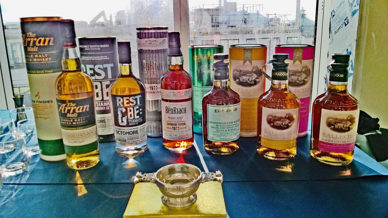 Nous commencerons par nous mettre en bouche avec un vin blanc (Fût de Chardonnay) et une belle distillerie (EDRADOUR). Nous resterons dans la même distillerie, mais avec un autre distillat (BALLECHIN), et deux maturations différentes. La première en fût de vin rouge et l’autre en fût de vin de Sauternes. Les fûts auront cette même région d’origine pour les trois dégustations suivantes, avec des distillats d’iles, (ARRAN et BRUICHLADDICH) et un distillat du speyside (BENRIACH)
