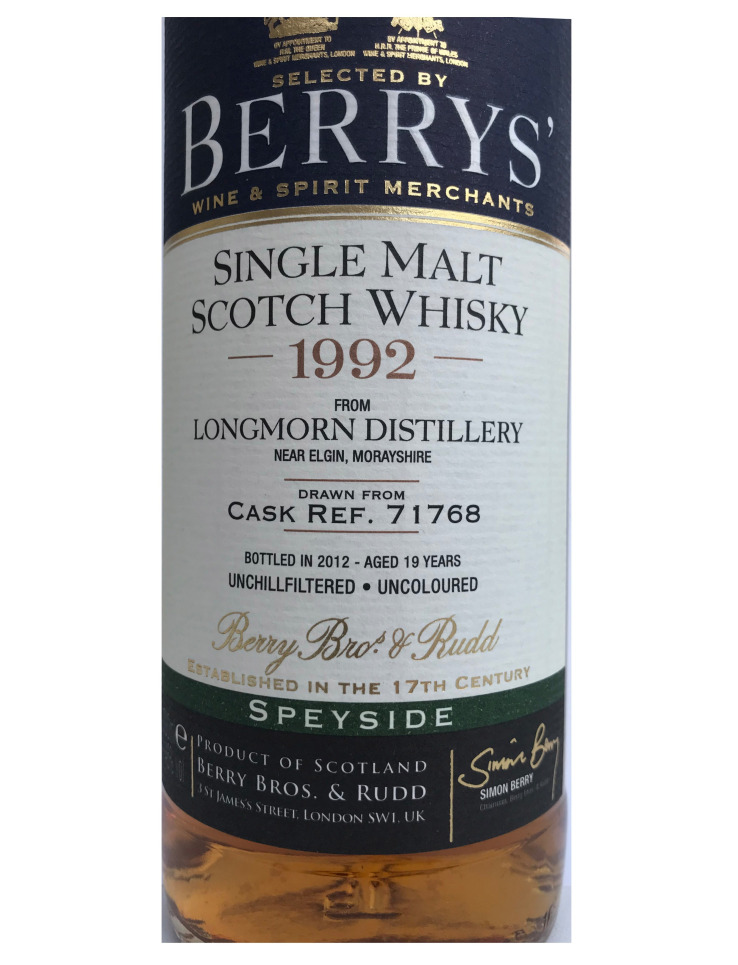 Nous continuons notre route par un LONGMORN de 1992 à 46% de 19 ans. C'est un single malt du Speyside. Version de chez Berry Bros and Rudd