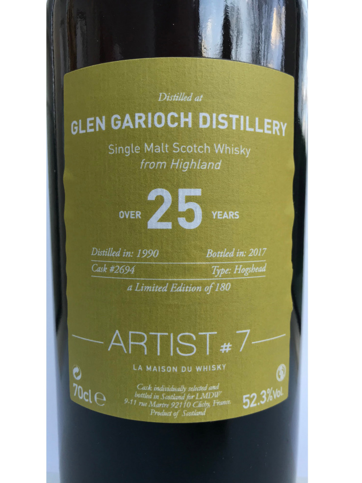 Et pour la fin un GLEN GARIOCH de 1990 à 52,3% de 25 ans. C'est un single malt des Highland, dans la Gamme Artist #7 de la Maison du Whisky.