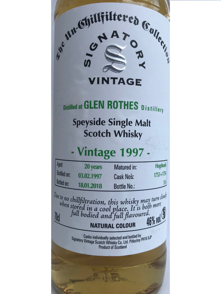 Nous continuons notre route par un GLEN ROTHES de 1997 à 46% de 20 ans. C'est un Single malt du Speyside dans une version de chez Sinatory Vintage.